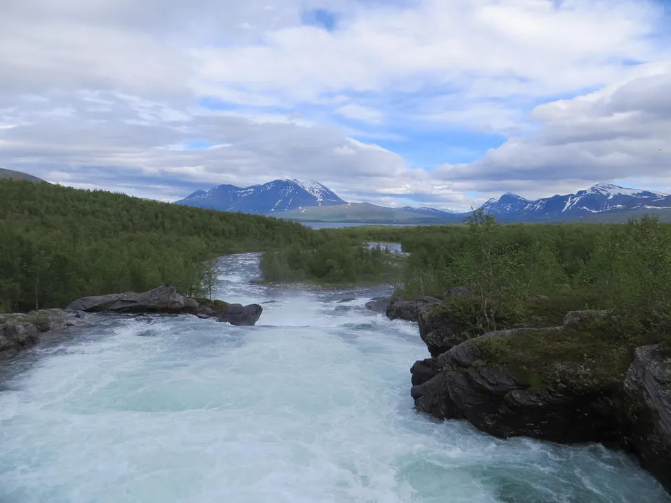 Sieberjåhkå från bron vid östra Kutjaurestugan med Áhká i bakgrunden.