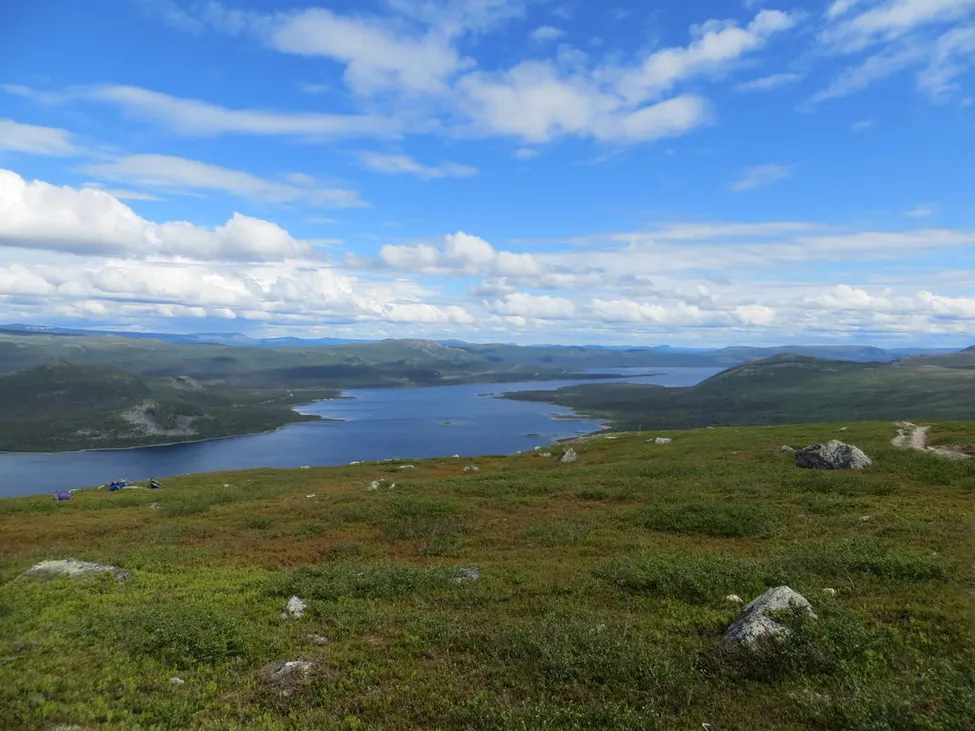 Sjön Langas med Saltoluokta fjällstation långt där nere.