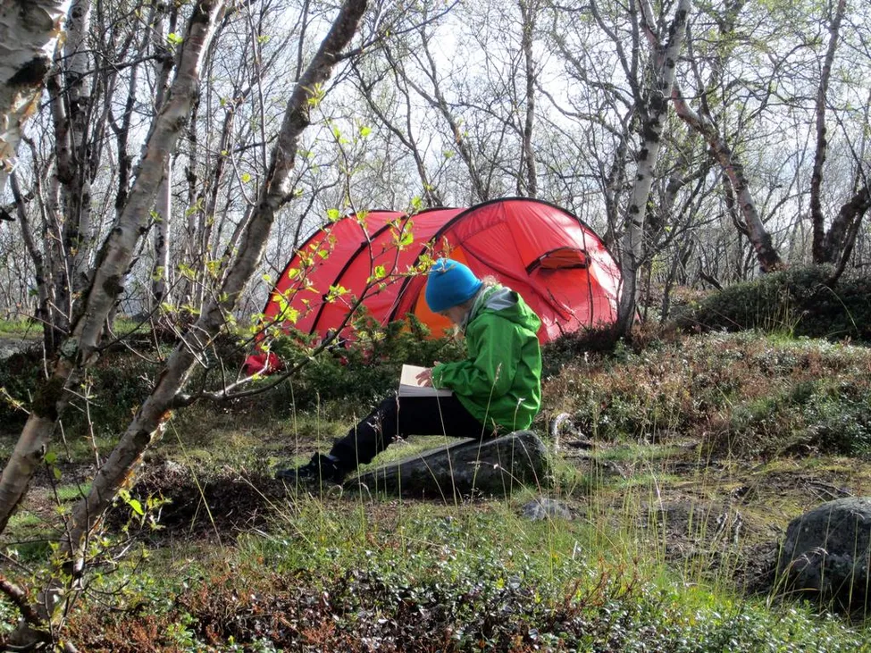 Vera läser bland björkarna på campingen vid Abisko turiststation.
