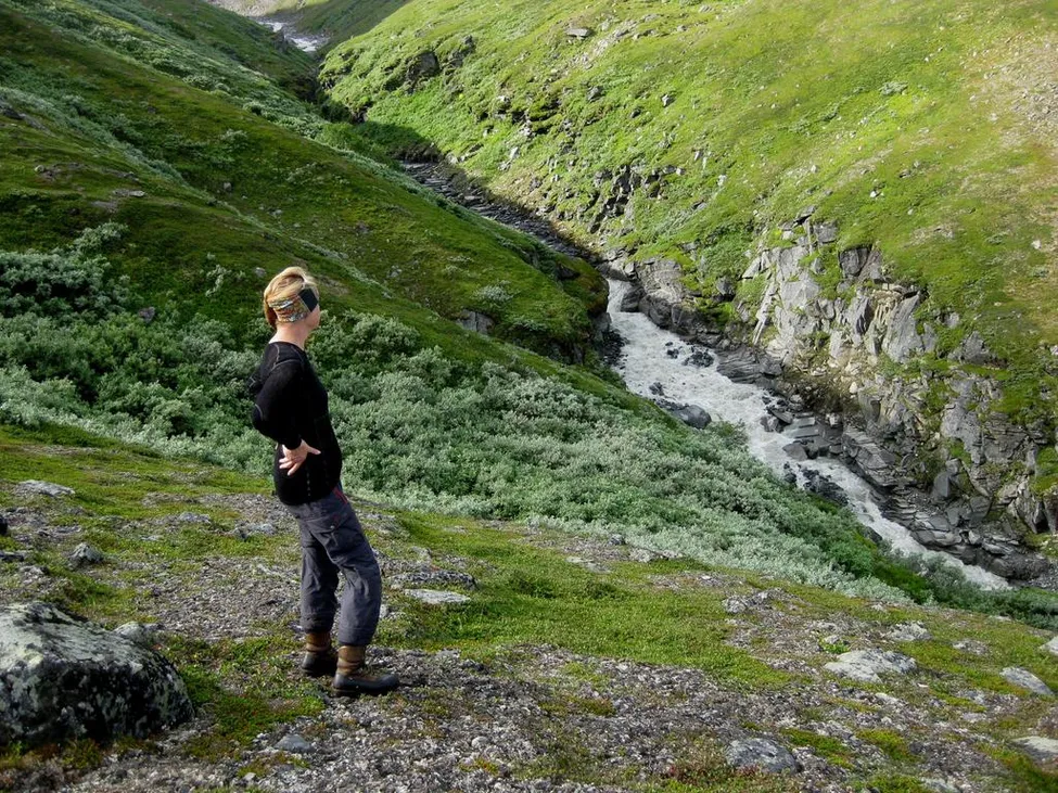 Strax ovanför trädgränsen blir jokkravinen så djup att det börjar bli svårt att komma åt vattnet. Nu blir det ont om tältplatser.