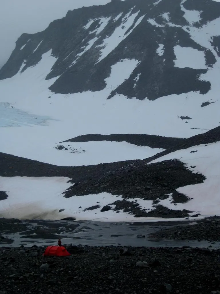 Informationen från Utsidan stämde: Det FINNS tältplatser nedanför Hyllglaciären, den näst största glaciären på Ahkka. Underlaget är en aning "svampigt" och lerigt - åtminstone i fuktig väderlek. Hade vi haft med oss snö-pinnar så hade valet av underlag varit enklare.