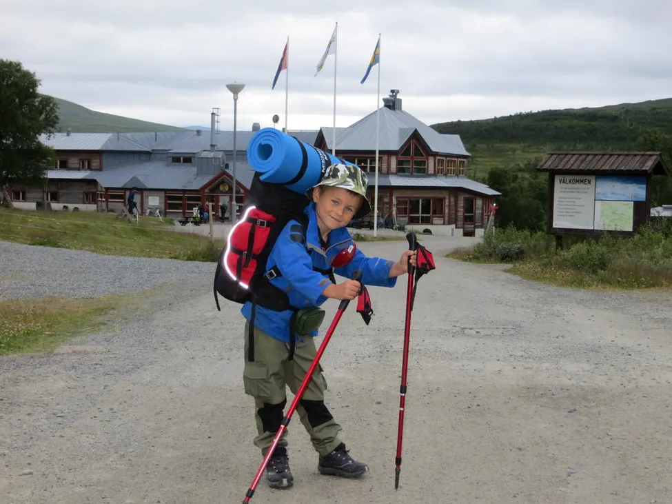 Albin 6 år inför sin första vandring. Här sugen på att få komma iväg med Storulvåns fjällstation i bakgrunden.