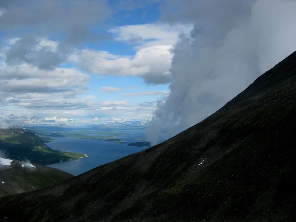 Sista dagen på Ahkka. Vi har brutit lägerplatsen och påbörjat den sista nedstigningen. Då kom molnen invällande från väster och regnet återvände. Så väl timat.