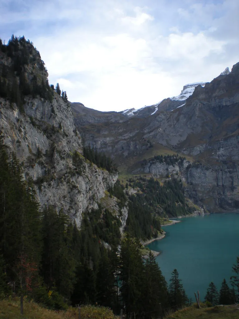 Oeschinensee. Blümlisalphütte på kammen i bakgrunden.