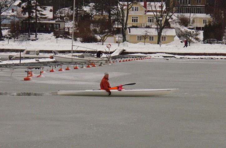 Det var ca 50 meter is vid klubben, sen 500 meter öppet i Femörekanalen och sen 500 meter is i Badhusviken. Han paddlade sedan runt Furön (ca 6,5 km) utan att se någon is annat än inne i någon vik. Mörkt när han kom tillbaka och det slumpade sig att jag just då korsade vägbron och tog ett kort till...