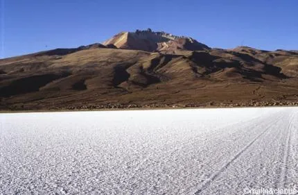 Vulkan vid kanten av saltöken på 4000 meters höjd i Bolivia. Saltöknen är en helt fantastisk plats att uppleva, beskrivs bäst som vitt hav.