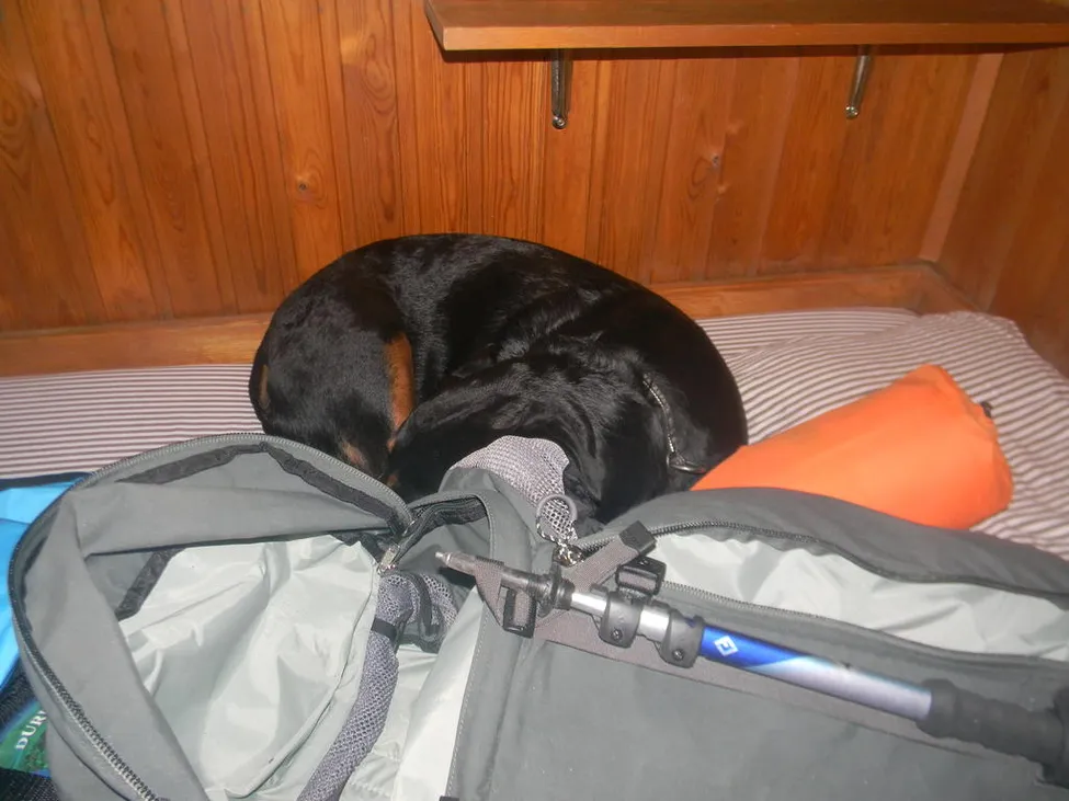 Nix, hon får inte sova i sängarna i stugan, men här hade hon hoppat upp olovandes och somnat. Svårt att väcka henne då...