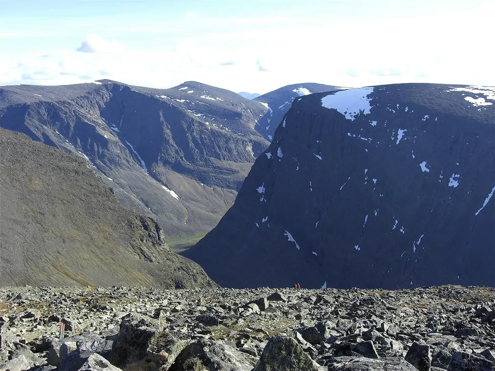 Vägen ned från Vierranvarri ser man Duolbagorni, Skárttoaivi, Singicohkka