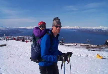 Skidåkning på pappas rygg i Narvik, lite knepiga regler i Narvik då man inte fick åka släplift med barn på ryggan men helt OK att åka sittlift.