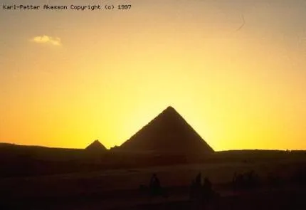 Bilden är tagen precis när solen går ner bakom en av de mindre pyramiderna på Giza platån, Kairo, Egypten
