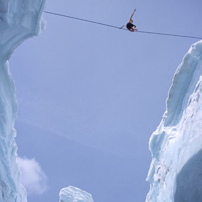 Eiliv Ruud tränar balans och fokusering inför brantåkning på stora berg. Linan är uppsatt över en 25m djup glaciärsspricka på Vallé Blanche i Chamonix. Själv reppellerade jag ner och, som ni ser, fotade underifrån