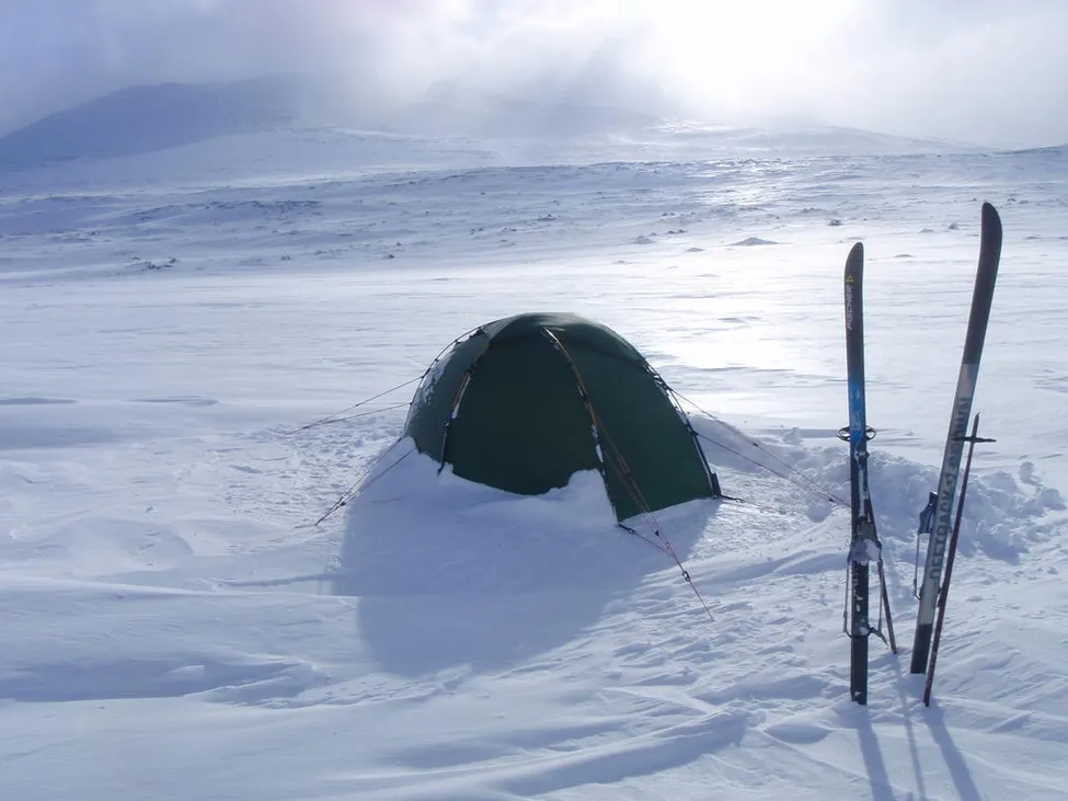 Sarekbákte och Sarektjåhkkå Nordtoppen 2056 skymtar genom snöyran.