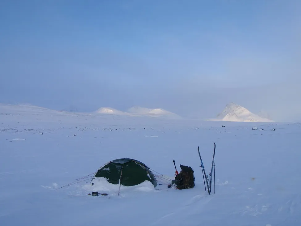 Gássakammen i mitten och Suottasjtjåhkkå t.h. i kallt solljus.