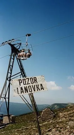 "Varning för linbanan!" utropar skylten som sitter precis under linbanan som går från staden Pec pod Snezkou upp till Tjeckiens högsta berg Snezka.