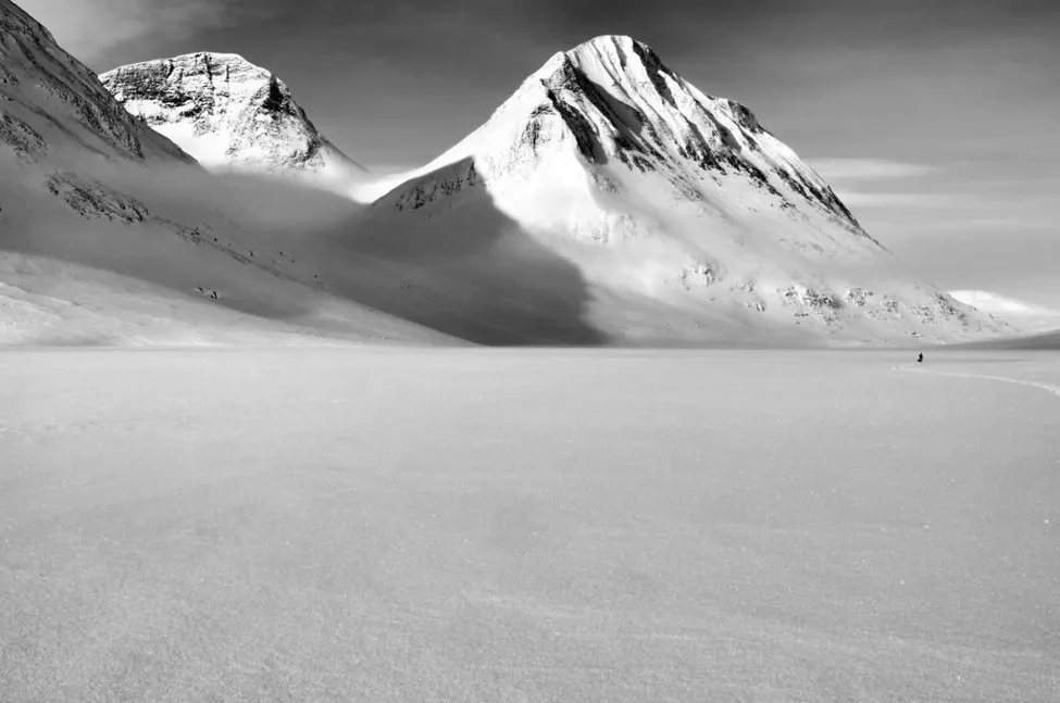 Den ohyggliga skarpa skuggan från Souttasjåhkka svarar så bra mot den pyttelilla skidåkaren.