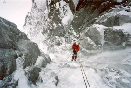 Anna Simlund firar av från Gabarrou-Albinonicouloiren, Mont Blanc du Tacul.