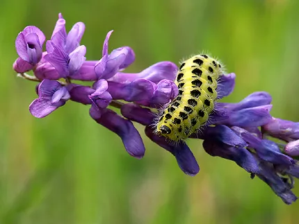 Jättehäftig bild! Skön kontrast mellan den prickiga larven och den lila blomman. Proffsigt.