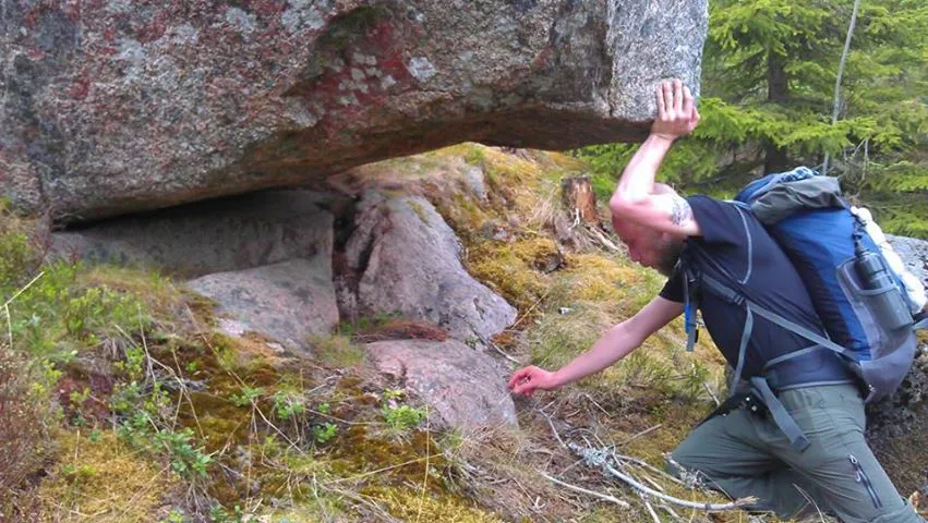 Det måste vara en vältränad person som kan lyfta upp stenblocket med bara en arm. Själv måste jag använda båda armarna.