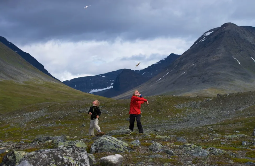 Barnen leker med små balsaplan, flög bra i vinden