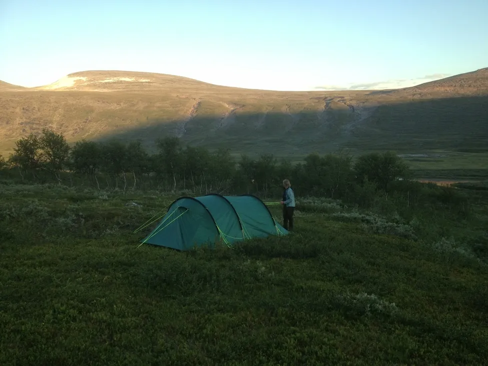 Vi gav upp kl 22,30 tältade vid första bästa vattendrag (Smuolevagge).