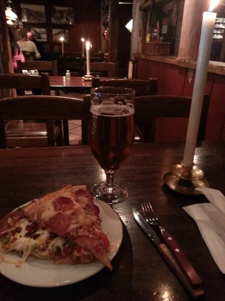 Ensam på pizza-buffé med en kall öl. Förväntningarna på morgondagen är stora.