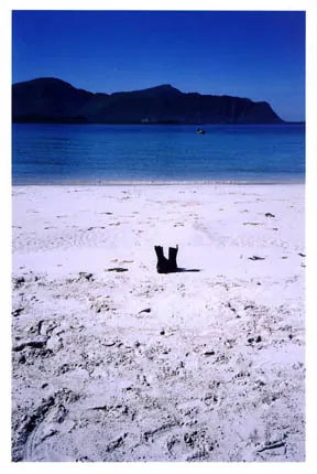 Vi bilade i Lofoten i sommar. Air Condition i all ära, men jag har frusna fötter så jag satt med kängorna på... När vi klev ur bilen och såg stranden så åkte de av och jag gick och strosade vid vattenbrynet... jag vände mig om och fick se mina grova kängor stå där alldeles ensamma och blev lite full i skratt...