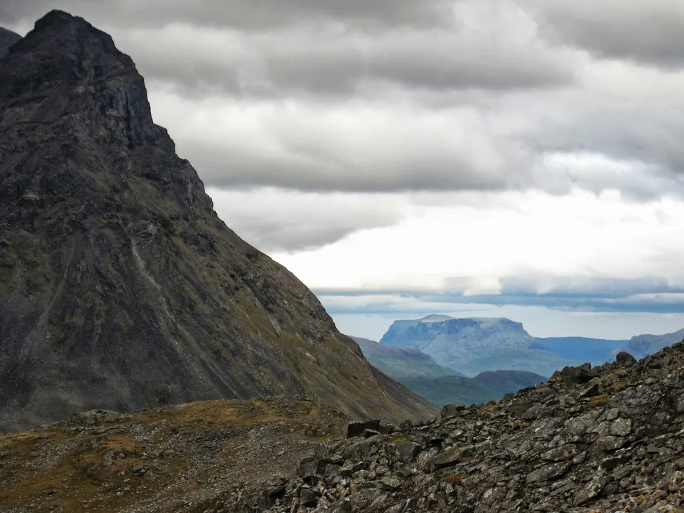 På väg upp mot Låddebakte fick jag denna utsikt. Skaplig... : ) Stour Skoarkki till vänster. Tjahkkelij i färran.
