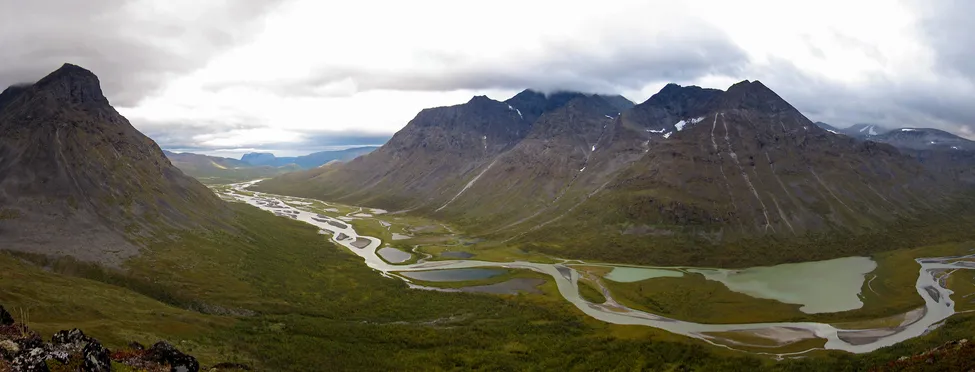 Vy över Rapadalen / Rapaselet från Låddebakte. Vackert!! Bielloriehppe-massivet på andra sidan dalgången. Förstora bild!