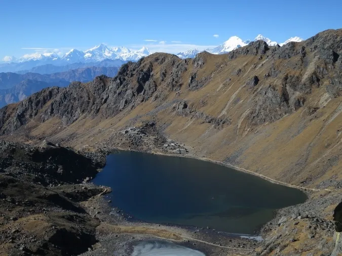 8. Gosainkund Lake och byn Gosainkund 4400 meter. Manaslumassivet till vänster.