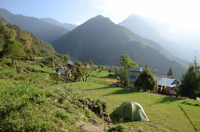 28. Camping i Yamphudin 2200 meter. Det fanns två Yamphudin. Den riktiga byn ligger 500 meter lägre.