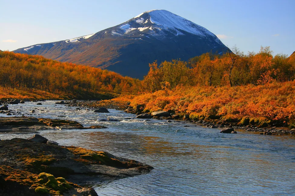 Hösten när den är som bäst. Kontrasterna mellan Nåites snöklädda topp, fjällbjörkskogen som glöder samt Sarvesjåkkås isblå glaciärvatten är fullständigt magisk.