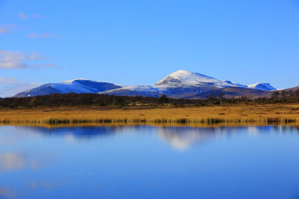 Vintern börja ta ett grepp om fjällsluttningarna. I Fålåtjärnens spegelblanka yta blir fjällets skönhet dubblerad denna dag.