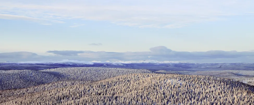 En vintrig vy från skog till fjäll