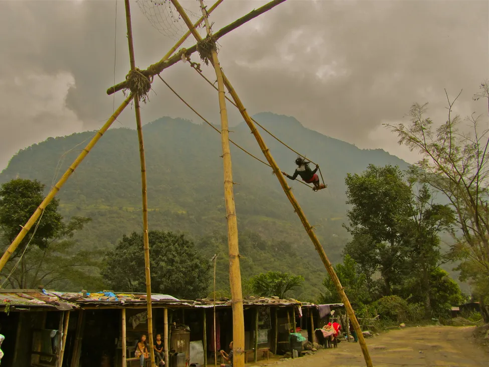 Traditionell gunga på bambuställning vars säkerhet nog skulle ifrågasatts mer än en gång i trygga Sverige.