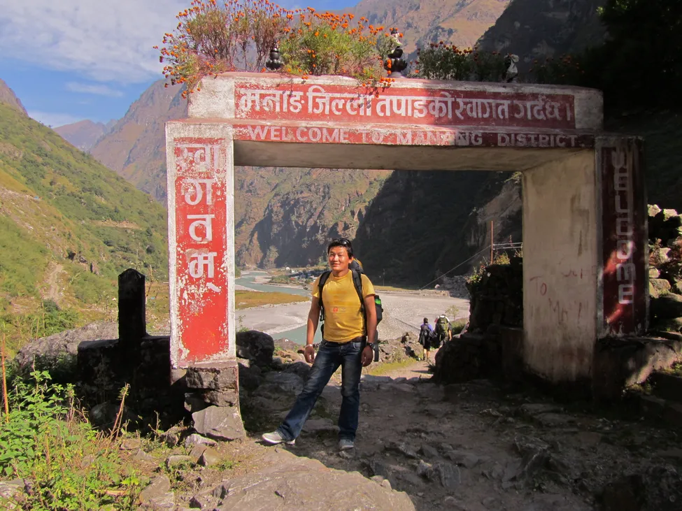 Porten in till Manang, Byn Tal syns i floddalen bakom. Min guide Kharijiang poserar.