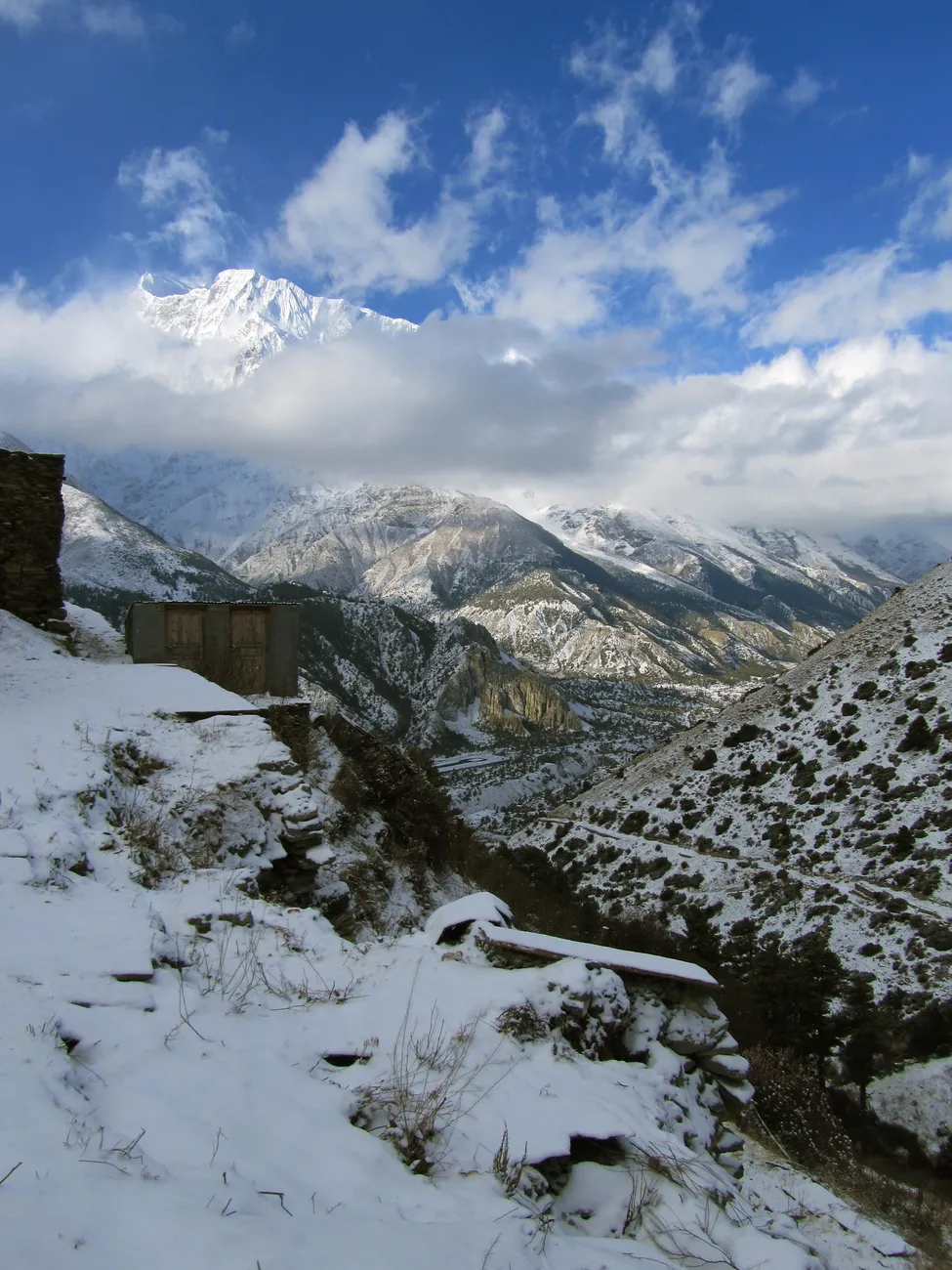 Morgon i Ngawal, Annapurna III uppe till vänster.