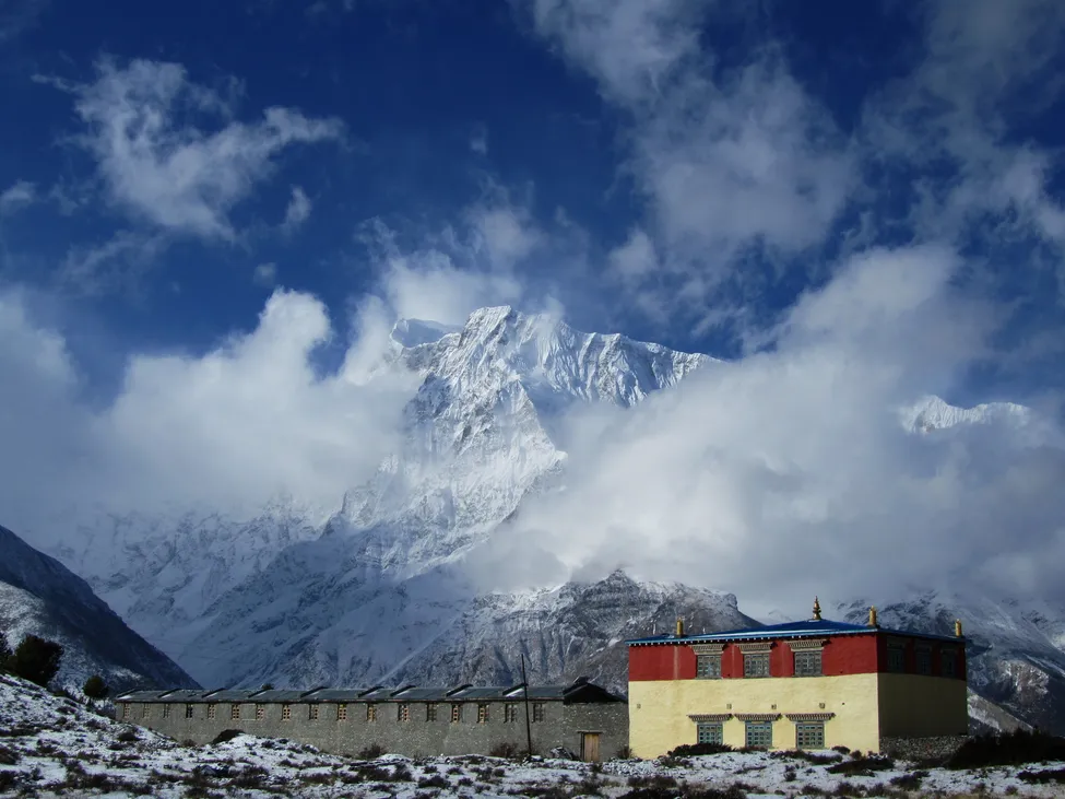 Kloster strax efter Ngawal mot bakgrund av Annapurna III.