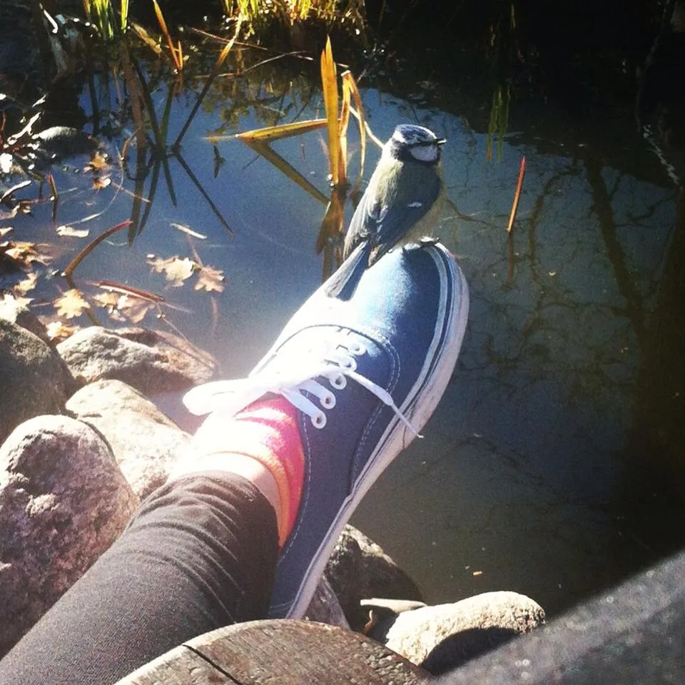 Vad händer sedan? Jo den flyger upp och sätter sig på min fot.