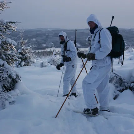 Min bror och hans kompis på väg ut på ett kalhygge för att spana efter fågel.
