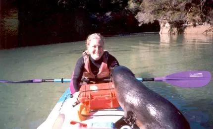 Den hoppade upp pa kajaken tva ganger i Shag Harbour, en lagun som endast aer paddelbar vid hoegvatten. Abel Tasmans Nationalpark, Nya Zeeland augusti 2003