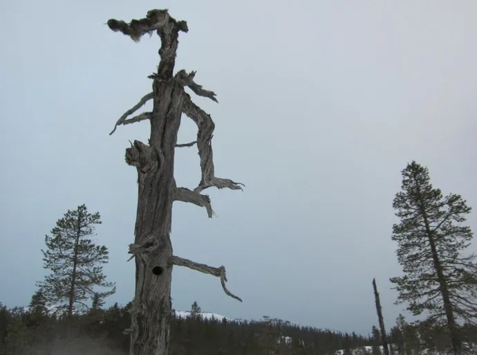 Detta vackra träd stod vid tjärnen där vi slog läger första natten. Lägg märke till det fina fågelboet.
