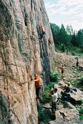 En miljöbild av stora klippan vid vårberget, flera klättrare på väg upp.
