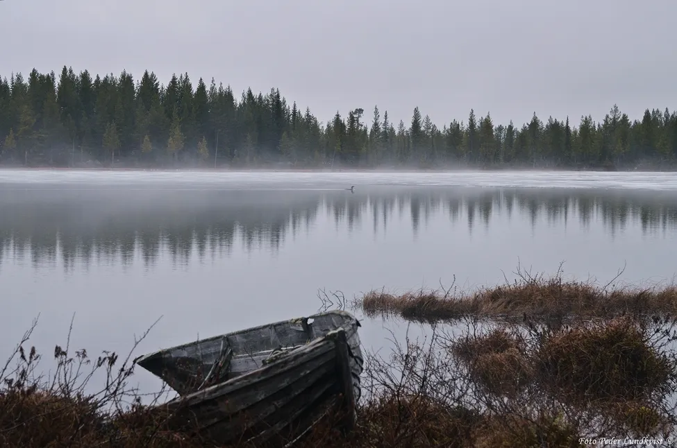 I den tidiga vårmorgonen glider sakta,nästan spöklikt dimman längs den lilla tjärnen. Det ligger fortfarande en del is kvar,och i den trollska stämningen ropar storlommen medan ett stilla vårregn börjar falla.