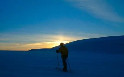 Solen går ner bakom skidåkarens mössa... Ett ljushuvud på bild ;-)