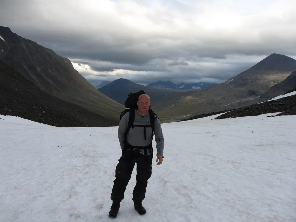 Jag på snödriva öster om passet i Niejdariehpvagge