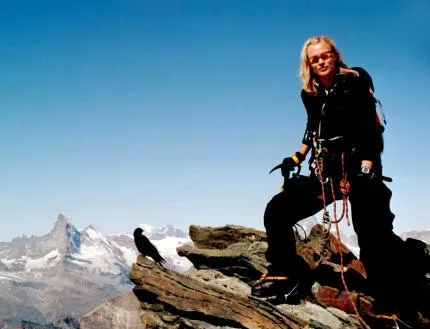 Toppfoto med Matterhorn i bakgrunden. Fågeln var lika orädd för människor som för höjd