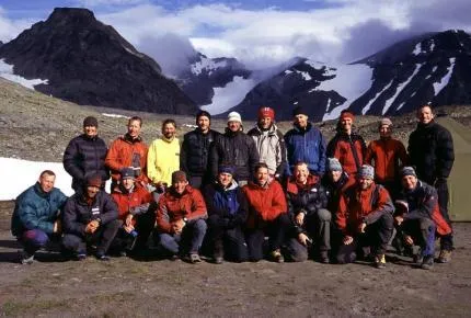 Gruppbild över alla deltagare och instruktörer på klätterförbundets kebkurs 2005.