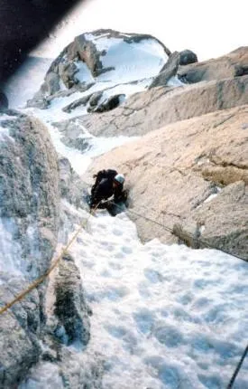 Håkan Borgquist följer andra replängden på en minst sagt ganska upptrampad Goulotte Chere, nordtriangeln på Mont Blanc du Tacul.