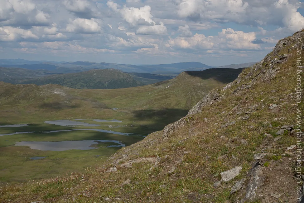 Från Tjaallinge, nere i dalen syns Tjaallingenjaevrie och till höger skymtar Prånhtsoe.
