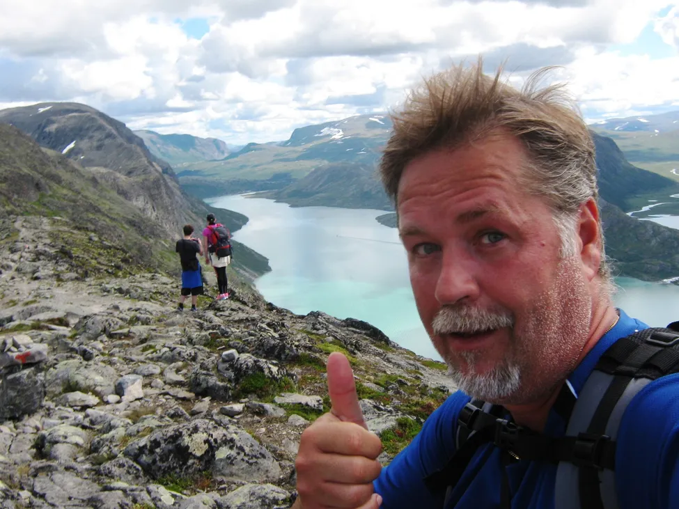 Jukka gör tummen upp för den norska fjällvärlden och vandringen